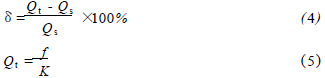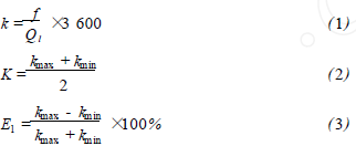 將過熱蒸汽流量計在標準水裝置上,分別用頻譜分析和脈沖計數的方法進行標定,流體介質為水未加氣體,采用的標準傳感器為精度等級為0.2級的電磁流量計。在每個流量測量點上的儀表系數用公式(1)計算,然后用式(2)計算得到*終儀表系數K。Ql為被測水的流量值,f為每一個流量點得到的頻率,k為每個測量點得到的儀表系數。kmax、kmin分別為試驗流量范圍內得到的*大與*小的儀表系數。儀表系數的線性度E1用式(3)來計算。