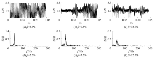 試驗發現,氣相的加入對過熱蒸汽流量計測量的影響顯著,譜分析和脈沖計數兩種方法隨著氣相注入的增加其表現也不同。圖4反映了水流量12m3/h時,注入不同氣含率β時A點的模擬信號,如圖4(a~c)所示;經譜分析后得到的頻率值,如圖4(d~f)所示;用脈沖計數方法得到的脈沖信號,如圖4(g~i)所示。圖4顯示,當注入氣量不大時,對過熱蒸汽流量計的影響不大,無論是譜分析結果還是脈沖計數得到的結果都比較好。當注入的氣量進一步增加時,渦街原始信號強度和穩定性逐漸變差,渦街頻率信號會被干擾信號所淹沒,反映到譜分析圖是,渦街頻率的譜能量減小,干擾信號的譜能量加強;對于脈沖信號,會因為一些旋渦信號減弱,形成脈沖缺失現象,而不能真實地反映渦街產生的頻率。