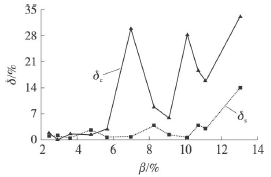 將試驗數據進行處理,得到了過熱蒸汽流量計測量誤差隨氣相含率變化的情況,如圖5所示。其中δs為譜分析方法的測量誤差,δc為脈沖計數方法的測量誤差。過熱蒸汽流量計的測量誤差用式(4)來計算。其中Qs為裝置中標準表測量出的管道總流量,Qt為試驗管段中過熱蒸汽流量計的測量值。將譜分析和脈沖計數得到的頻率值和儀表系數分別代入式(5)計算Qt值。從圖中可以看出氣相含率的增加兩種測量方法得到的誤差并不相同。當含氣率不高時,0<β<6%,譜分析法的平均誤差為1.226%,*大誤差為2.687%,脈沖計數法的平均誤差為1.583%,*大誤差為2.898%,因此譜分析法與脈沖計數法的測量誤差區別不大,譜分析沒有明顯的優勢;在氣相含率進一步增加時,6%<β<14%,譜分析法的平均誤差為3.975%,*大誤差為14.058%,脈沖計數法的平均誤差為20.053%,*大誤差為33.130%,脈沖計數的方法得到的測量誤差遠大于譜分析方法。